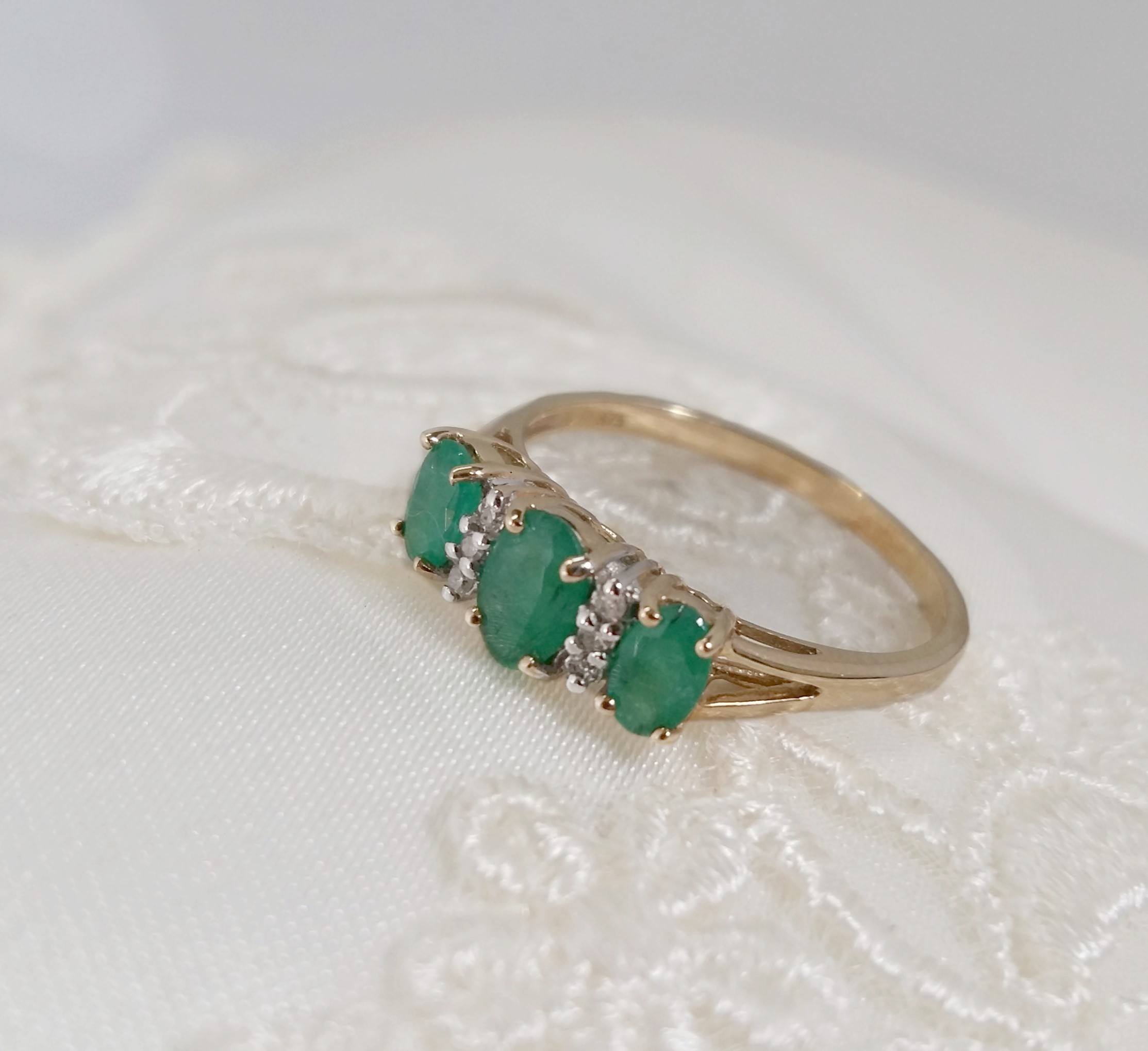 Beautiful 9ct Gold Three Stone Emerald Diamond Ring