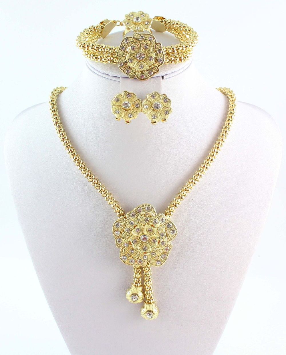 Women Gold Color New Design Austrian Crystal Africa Dubai Wedding Party Flower Necklace Bangle Earring Ring Jewelry Sets